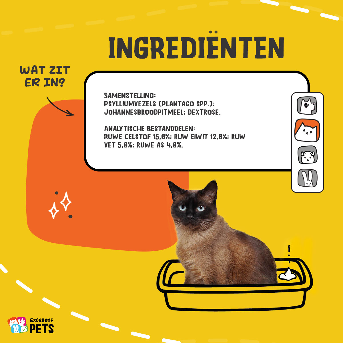 Excellent Pets Cat Psyllium+ is een aanvullend diervoeder voor katten in poedervorm. Het zorgt voor een zachtere darminhoud, bevordert een goede maag- en darmwerking en draagt bij aan het verminderen van het ontstaan van haarballen.