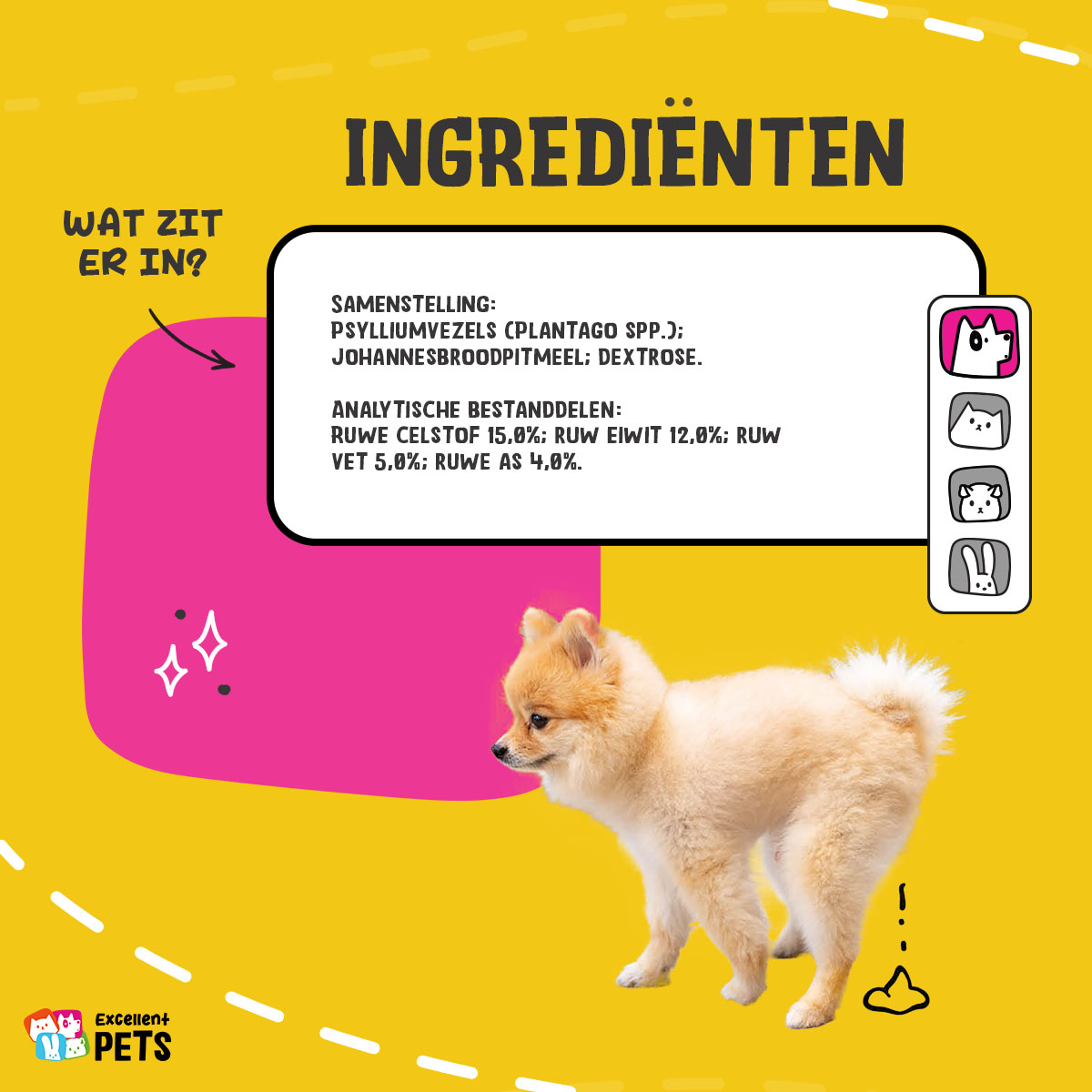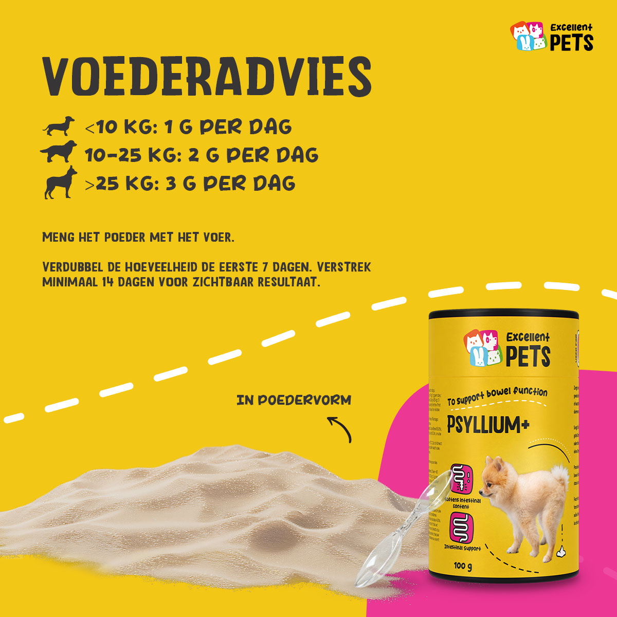 Excellent Pets Dog Psyllium+ is een aanvullend diervoeder voor honden in poedervorm. Het zorgt voor een zachtere darminhoud, bevordert een goede darmwerking en stimuleert de darmen na de operatie.